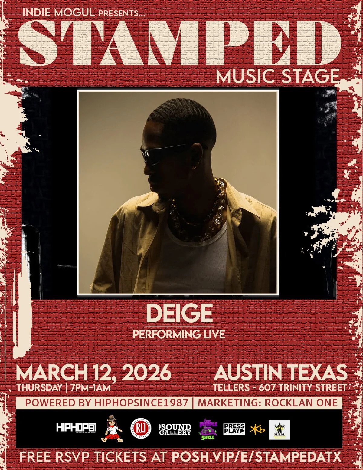 A new spotlight rises in the heart of Austin. Stamped Music Stage arrives with the energy of a motion picture and the intensity of a moment that can redefine an artist’s entire career. Presented by Hip Hop Since 1987 and RockLan One, this is the stage built for Hip Hop, RnB, and Urban artists who want to be seen, heard, and remembered.